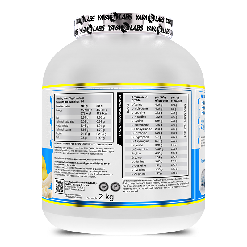 Give your muscles the fuel they need with Yava Labs Elite Whey Protein. Packed with 22g of high-quality whey protein concentrate per serving, this formula is designed to support muscle growth and enhance recovery.