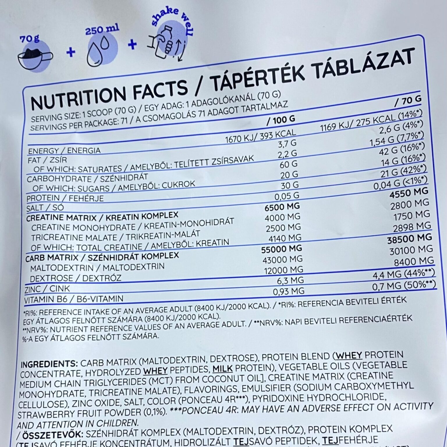 Each serving (120 g) delivers 34 g of premium protein to support muscle maintenance and growth, combined with 63 g of carbohydrates to fuel training performance and recovery. To push results even further, the formula is enriched with 3 g of creatine per serving, helping improve strength and performance during high-intensity workouts.