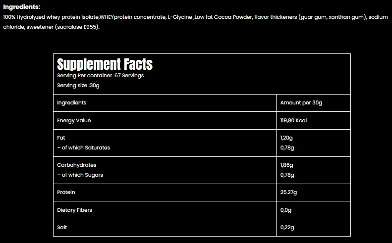 Hydro was made to provide High quality bioavailable protein that’s easily absorbed. Hydro contains naturally occurred EAA (including BCAA), L Glutamine and all the amino acids. Hydro contains low Fat and without any added sugars. Ingredients: 100% Hydrolyzed Whey Protein Isolate, Whey Protein Concentrate, L-Glycine, Low Fat Cocoa Powder, Flavor Thickeners (Guar Gum, Xanthan Gum), Sodium Chloride, Sweetener (Sucralose E955). How to Use: Mix 1 scoop (30g) with 300–400 ml of cold water and shake vigorously. Take one serving immediately post workout or anytime you desire. Storage: Store in a cool, dry place after opening. Net Weight: 2kg